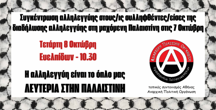 Συγκέντρωση αλληλεγγύης στους/ις συλληφθέντες/είσες της διαδήλωσης αλληλεγγύης στη μαχόμενη Παλαιστίνη στις 7 Οκτώβρη