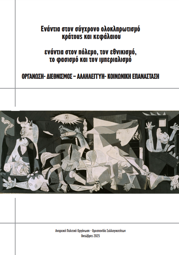 Κυκλοφόρησε σε έντυπη μορφή η μπροσούρα “Ενάντια στον σύγχρονο ολοκληρωτισμό κράτους και κεφαλαίου – Ενάντια στον πόλεμο, τον εθνικισμό, το φασισμό και τον ιμπεριαλισμό” της Αναρχικής Πολιτικής Οργάνωσης – Ομοσπονδίας Συλλογικοτήτων.Ακολουθούν το εισαγωγικό σημείωμα και τα περιεχόμενά της.