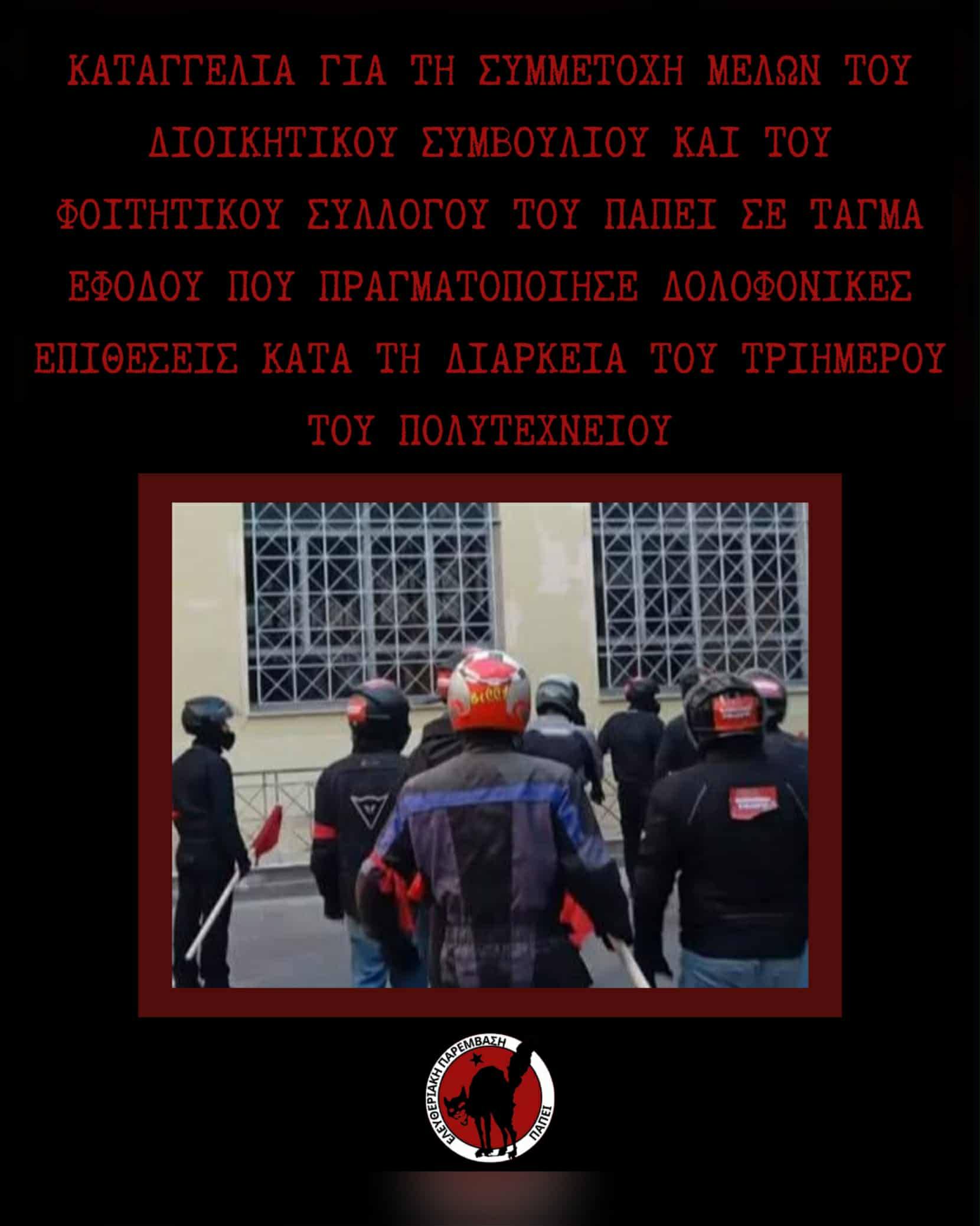 Καταγγελία για τη συμμετοχή μελών του διοικητικού συμβουλίου και του φοιτητικού συλλόγου του ΠΑΠΕΙ σε τάγμα εφόδου, που πραγματοποίησε δολοφονικές επιθέσεις κατά τη διάρκεια του τριημέρου του Πολυτεχνείου