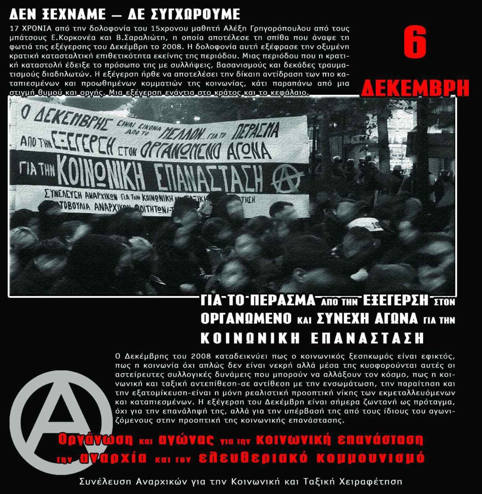 17 ΧΡΟΝΙΑ από την δολοφονία του 15χρονου Αλέξη Γρηγορόπουλου από τους μπάτσους Ε.Κορκονέα και Β.Σαραλιώτη, η οποία αποτέλεσε την σπίθα που άναψε τη φωτιά της εξέγερσης του Δεκέμβρη του 2008. Η δολοφονία αυτή εξέφρασε την οξυμένη κρατική κατασταλτική επιθετικότητα εκείνης της περιόδου. Μιας περίοδου που η κρατική καταστολή έδειξε το πρόσωπο της με συλλήψεις, βασανισμούς και δεκάδες τραυματισμούς διαδηλωτών. Η εξέγερση ήρθε να αποτελέσει την δίκαιη αντίδραση των πιο καταπιεσμένων και προωθημένων κομματιών της κοινωνίας, κάτι παραπάνω από μια στιγμή θυμού και οργής. Μια εξέγερση ενάντια στο κράτος και το κεφάλαιο.