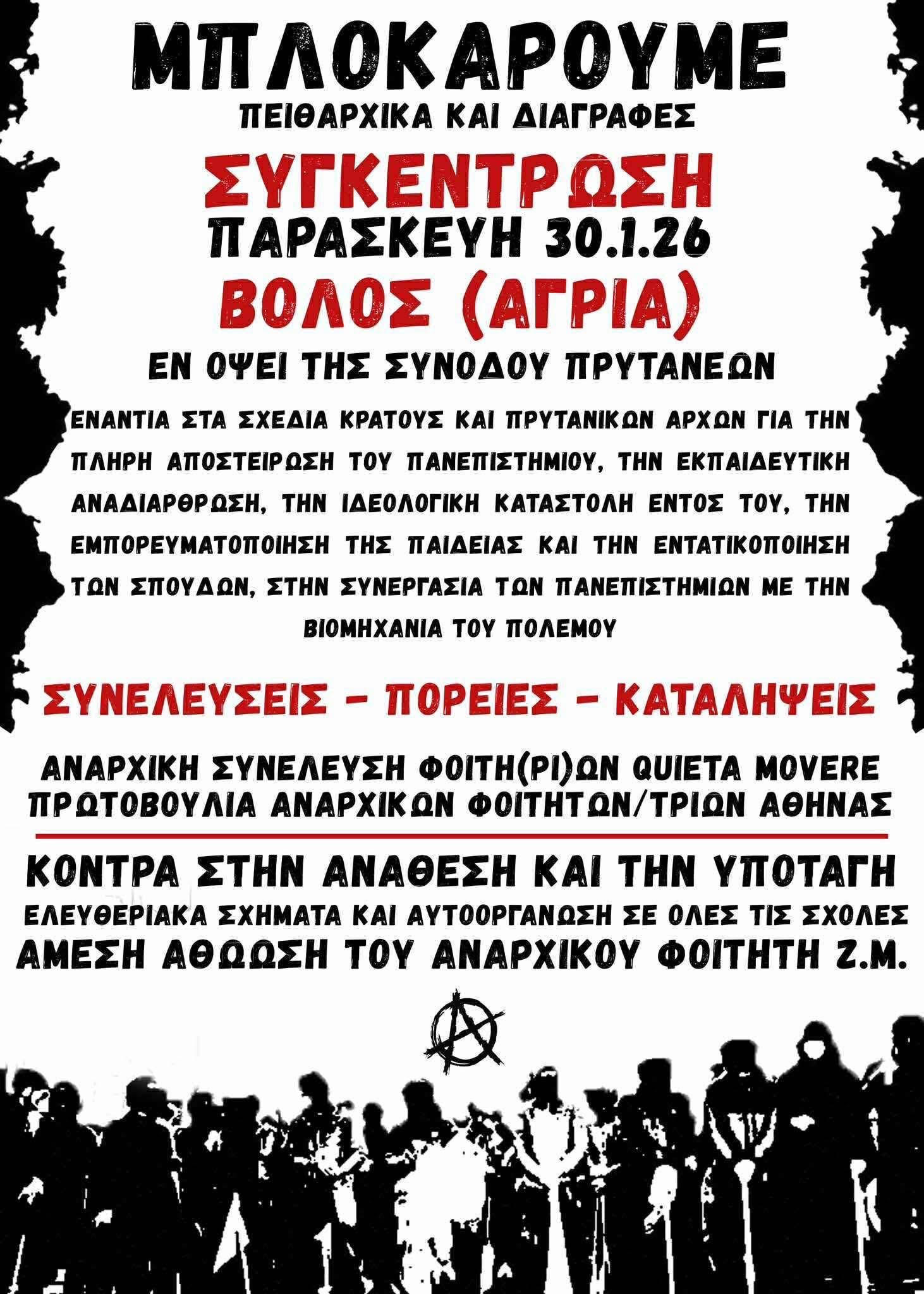 Στα τέλη του Ιανουαρίου θα πραγματοποιηθεί η εξ αναβολής Σύνοδος των Πρυτάνεων στον Βόλο, εν μέσω της πρωτοφανούς εφαρμογής του μέτρου των διαγραφών που αφορά πάνω από 300.000 φοιτητές/-τριές οι οποίοι/-ες έχουν ήδη σβηστεί από τα μητρώα των πανεπιστημίων, την ίδια ώρα που κράτος και πρυτάνεις προσπαθούν να παγιώσουν τη συνθήκη καταστολής στους χώρους ασύλου, με την απόπειρα διεξαγωγής πειθαρχικών σε φοιτητές/-τριές της Αρχιτεκτονικής σχολής του ΕΜΠ, η οποία τελικά απέτυχε έπειτα από δύο αλλεπάλληλες μαζικές συγκεντρώσεις, με την τοποθέτηση καμερών ασφαλείας στα πανεπιστήμια, και με τη σταθερή πλέον απαγόρευση διεξαγωγής πολιτικών και πολιτιστικών εκδηλώσεων σε πανεπιστημιακούς χώρους.Οι διαγραφές φοιτητών/-τριών, είναι ένα μέτρο που όχι απλώς δεν αποκόπτεται από την ευρύτερη κρατική επίθεση που συντελείται στην Παιδεία, αλλά αναδεικνύει και την πραγματική της φύση. Εν μέσω της νεοφιλελεύθερης επέλασης, τόσο το πανεπιστήμιο όσο και το σχολείο δε πρέπει απλώς να προσαρμόζονται στις ανάγκες των επιχειρηματικών συμφερόντων, αλλά να μετατρέπονται και τα ίδια σε επιχειρήσεις που θα λειτουργούν σύμφωνα με τους νόμους των αγορών. Έτσι η μόρφωση θα πρέπει να μετατρέπεται σε ένα εργαλείο για την οικονομική ανάπτυξη και μόνο, αφήνοντας πίσω τα «βαρίδια» που δεν μπορούν να συμβαδίσουν με τους ρυθμούς που η "ανάπτυξη" αυτή απαιτεί. Η διαδικασία της εκπαίδευσης αντί να βασίζεται σε μια μέθοδο αμφισβήτησης, διαλόγου και ζύμωσης, μπαίνει σε ένα καθεστώς εντατικοποίησης, με μοναδικό σκοπό το να παράξει τους επόμενους τεχνοκράτες που θα χρειαστεί η οικονομία, μέσα από γραμμές παραγωγής πειθήνιων και υπάκουων εξειδικευμένων εργατών, που δε θα φέρνουν αντιρρήσεις για τη ζωή και τον κόσμο που τα αφεντικά τους τούς έχουν ετοιμάσει.