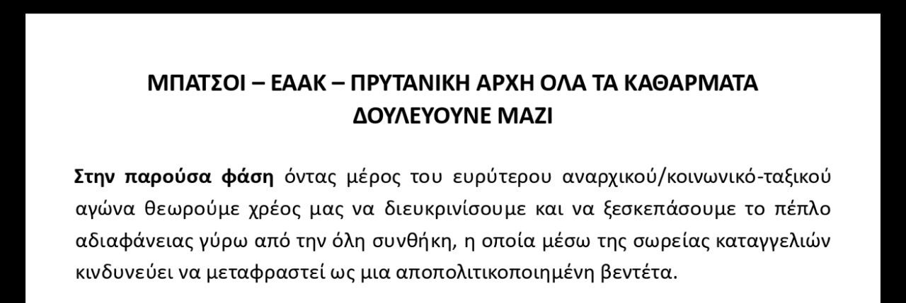 Στην παρούσα φάση όντας μέρος του ευρύτερου αναρχικού/κοινωνικό-ταξικού αγώνα θεωρούμε χρέος μας να διευκρινίσουμε και να ξεσκεπάσουμε το πέπλο αδιαφάνειας γύρω από την όλη συνθήκη, η οποία μέσω της σωρείας καταγγελιών κινδυνεύει να μεταφραστεί ως μια αποπολιτικοποιημένη βεντέτα.